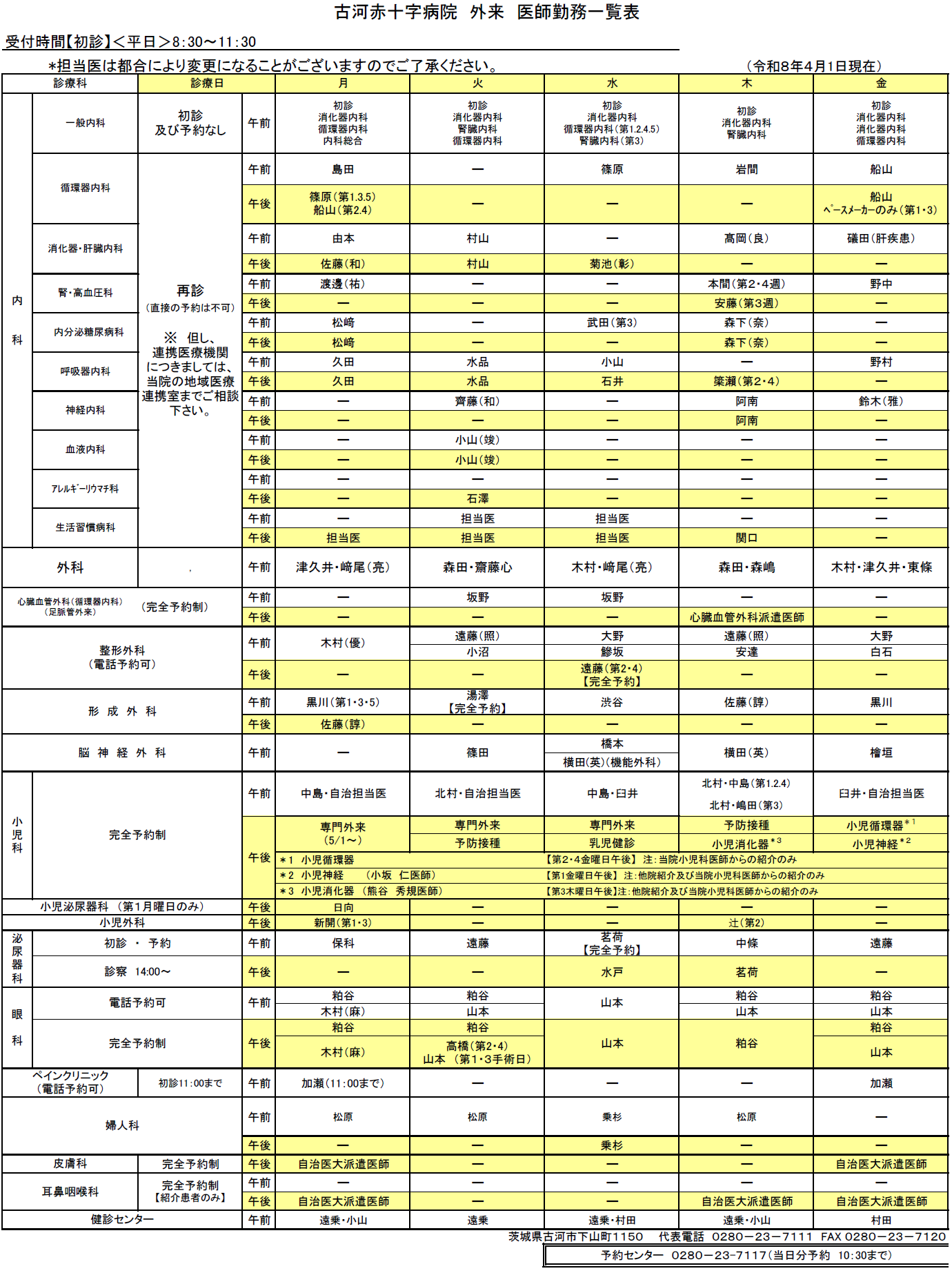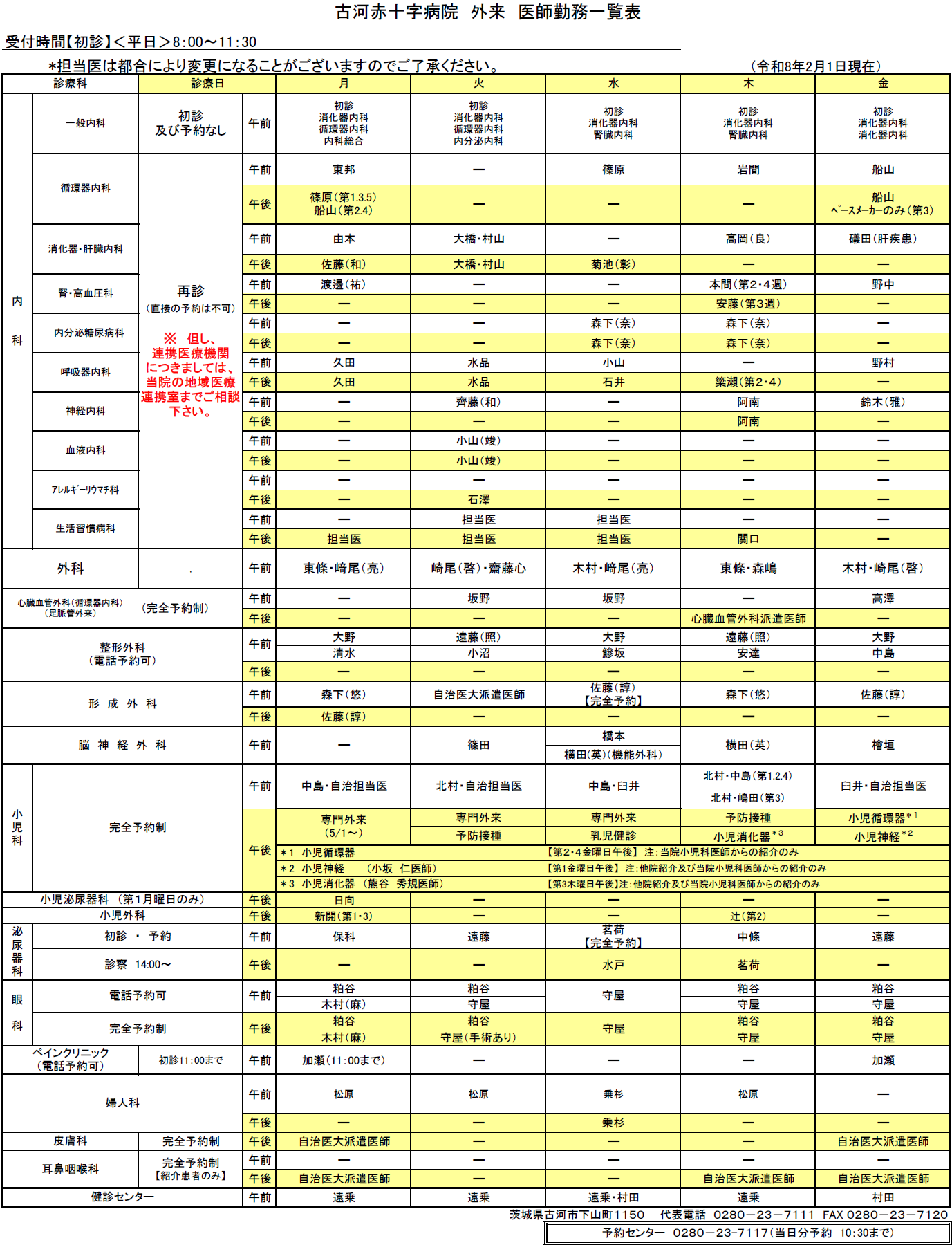 外来診療予定表